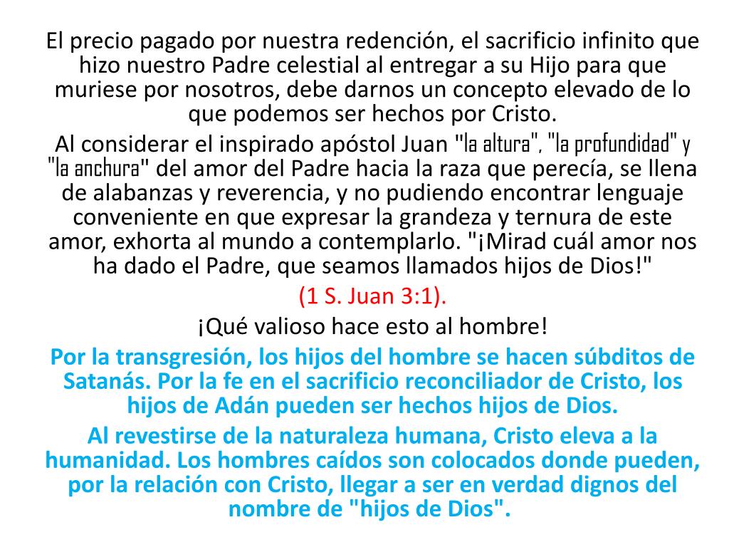 El precio pagado por nuestra redención, el sacrificio infinito que hizo nuestro Padre celestial al entregar a su Hijo para que muriese por nosotros, debe darnos un concepto elevado de lo que podemos ser hechos por Cristo. Al considerar el inspirado apóstol Juan "la altura", "la profundidad" y "la anchura" del amor del Padre hacia la raza que perecía, se llena de alabanzas y reverencia, y no pudiendo encontrar lenguaje conveniente en que expresar la grandeza y ternura de este amor, exhorta al mundo a contemplarlo. "¡Mirad cuál amor nos ha dado el Padre, que seamos llamados hijos de Dios!" (1 S. Juan 3:1). ¡Qué valioso hace esto al hombre! Por la transgresión, los hijos del hombre se hacen súbditos de Satanás. Por la fe en el sacrificio reconciliador de Cristo, los hijos de Adán pueden ser hechos hijos de Dios. Al revestirse de la naturaleza humana, Cristo eleva a la humanidad. Los hombres caídos son colocados donde pueden, por la relación con Cristo, llegar a ser en verdad dignos del nombre de "hijos de Dios".