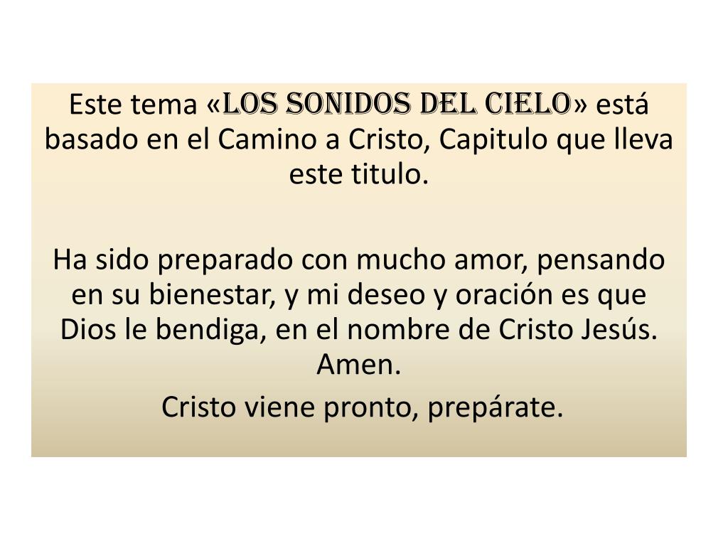 Este tema «los sonidos del cielo» está basado en el Camino a Cristo, Capitulo que lleva este titulo. Ha sido preparado con mucho amor, pensando en su bienestar, y mi deseo y oración es que Dios le bendiga, en el nombre de Cristo Jesús. Amen. Cristo viene pronto, prepárate.