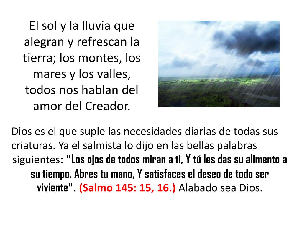 El sol y la lluvia que alegran y refrescan la tierra; los montes, los mares y los valles, todos nos hablan del amor del Creador. Dios es el que suple las necesidades diarias de todas sus criaturas. Ya el salmista lo dijo en las bellas palabras siguientes: "Los ojos de todos miran a ti, Y tú les das su alimento asu tiempo. Abres tu mano, Y satisfaces el deseo de todoser viviente". (Salmo 145: 15, 16.) Alabado sea Dios.