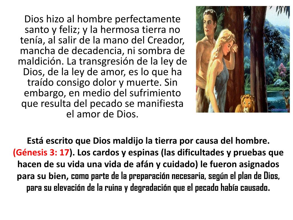 Dios hizo al hombre perfectamente santo y feliz; y lahermosa tierra no tenía, al salir de la mano del Creador,mancha de decadencia, ni sombra de maldición. Latransgresión de la ley de Dios, de la ley de amor, es lo queha traído consigo dolor y muerte. Sin embargo, en mediodel sufrimiento que resulta del pecado se manifiesta elamor de Dios. Está escrito que Dios maldijo la tierra porcausa del hombre. (Génesis 3: 17). Los cardos y espinas (las dificultades y pruebas que hacen de su vida una vidade afán y cuidado) le fueron asignados para su bien,como parte de la preparación necesaria, según el plan deDios, para su elevación de la ruina y degradación que elpecado había causado.