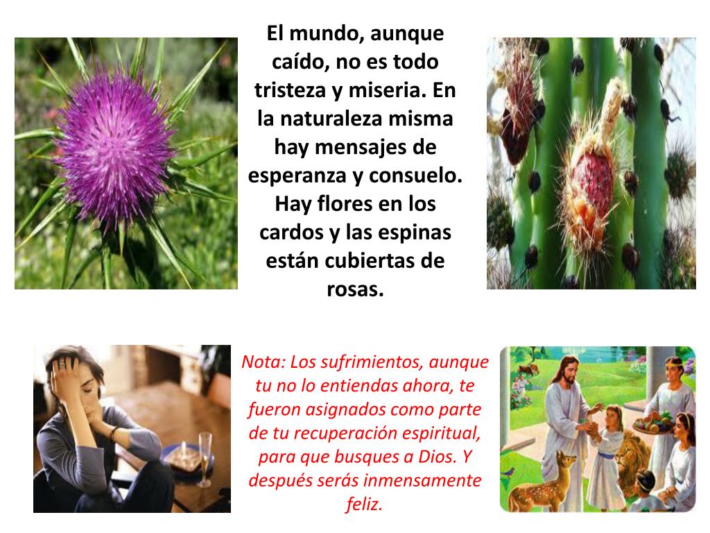 El mundo, aunque caído, no estodo tristeza y miseria. En la naturaleza misma haymensajes de esperanza y consuelo. Hay flores en loscardos y las espinas están cubiertas de rosas. Nota: Los sufrimientos, aunque tu no lo entiendas ahora, te fueron asignados como parte de tu recuperación espiritual, para que busques a Dios. Y después serás inmensamente feliz.