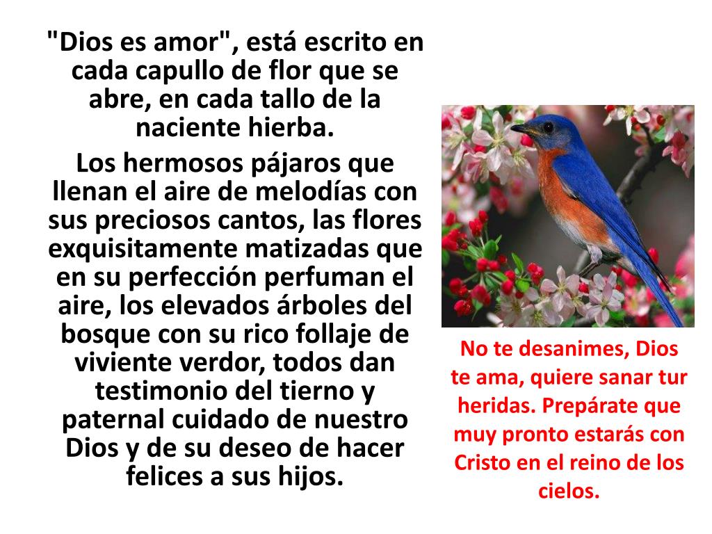 "Dios es amor", está escrito en cada capullo de flor quese abre, en cada tallo de la naciente hierba. Los hermosospájaros que llenan el aire de melodías con sus preciososcantos, las flores exquisitamente matizadas que en superfección perfuman el aire, los elevados árboles delbosque con su rico follaje de viviente verdor, todos dantestimonio del tierno y paternal cuidado de nuestro Dios yde su deseo de hacer felices a sus hijos. No te desanimes, Dios te ama, quiere sanar tur heridas. Prepárate que muy pronto estarás con Cristo en el reino de los cielos.