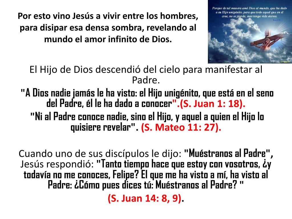 Por esto vino Jesús avivir entre los hombres, para disipar esa densa sombra, revelando al mundo el amor infinito de Dios. El Hijo de Dios descendió del cielo para manifestar al Padre. "A Dios nadie jamás le ha visto: el Hijo unigénito,que está en el seno del Padre, él le ha dado a conocer".(S. Juan 1: 18). "Ni al Padre conoce nadie, sino el Hijo, yaquel a quien el Hijo lo quisiere revelar". (S. Mateo 11: 27). Cuando uno de sus discípulos le dijo: "Muéstranos alPadre", Jesús respondió: "Tanto tiempo hace que estoycon vosotros, ¿y todavía no me conoces, Felipe? El queme ha visto a mí, ha visto al Padre: ¿Cómo pues dices tú:Muéstranos al Padre? " (S. Juan 14: 8, 9).