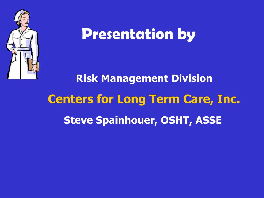 Occupational Safety for the Nursing Profession. Presentation by. Risk Management Division. Centers for Long Term Care, Inc. Steve Spainhouer, OSHT, ASSE.