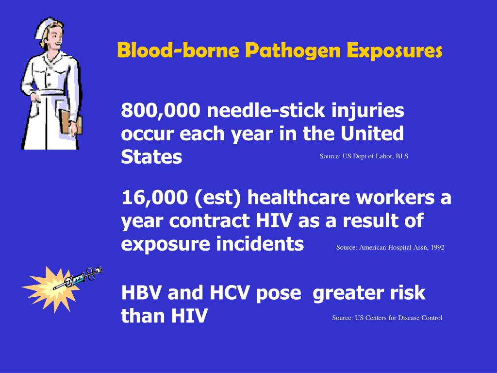Blood-borne Pathogen Exposures 800,000 needle-stick injuries occur each year in the United States Source: US Dept of Labor, BLS 16,000 (est) healthcare workers a year contract HIV as a result of exposure incidents Source: American Hospital Assn, 1992 HBV and HCV pose greater risk than HIV Source: US Centers for Disease Control