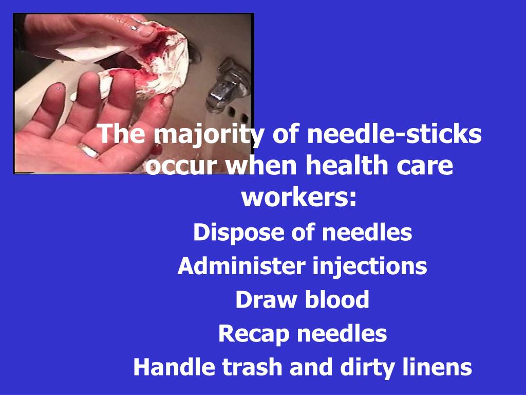 The majority of needle-sticks occur when health care workers: • Dispose of needles • Administer injections • Draw blood • Recap needles • Handle trash and dirty linens