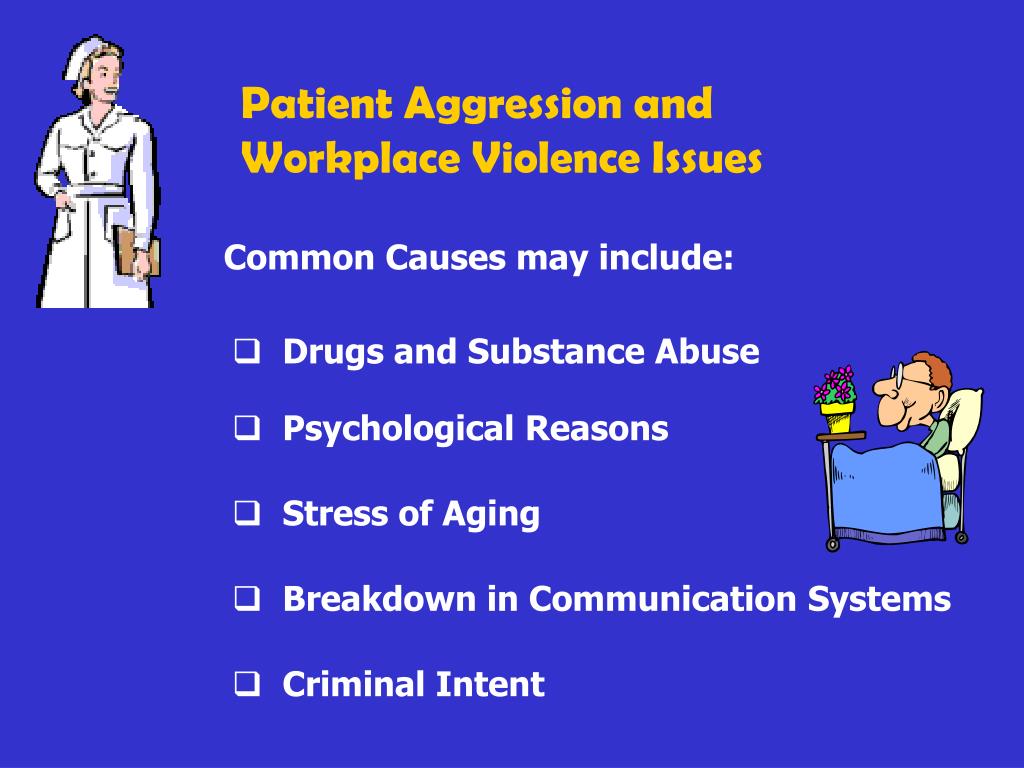 Patient Aggression and Workplace Violence Issues Common Causes may include: • Drugs and Substance Abuse • Psychological Reasons • Stress of Aging • Breakdown in Communication Systems • Criminal Intent