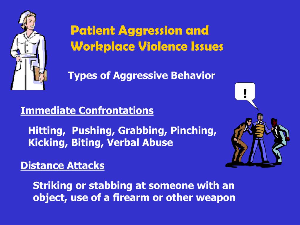 Patient Aggression and Workplace Violence Issues Types of Aggressive Behavior ! Immediate Confrontations Hitting, Pushing, Grabbing, Pinching, Kicking, Biting, Verbal Abuse Distance Attacks Striking or stabbing at someone with an object, use of a firearm or other weapon