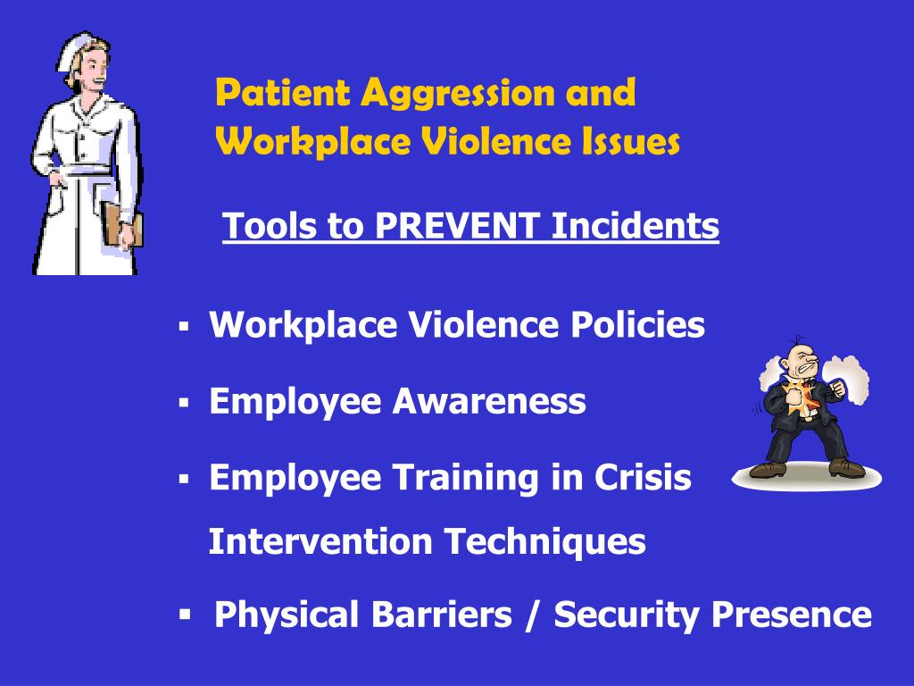 Patient Aggression and Workplace Violence Issues Tools to PREVENT Incidents • Workplace Violence Policies • Employee Awareness • Employee Training in Crisis Intervention Techniques • Physical Barriers / Security Presence