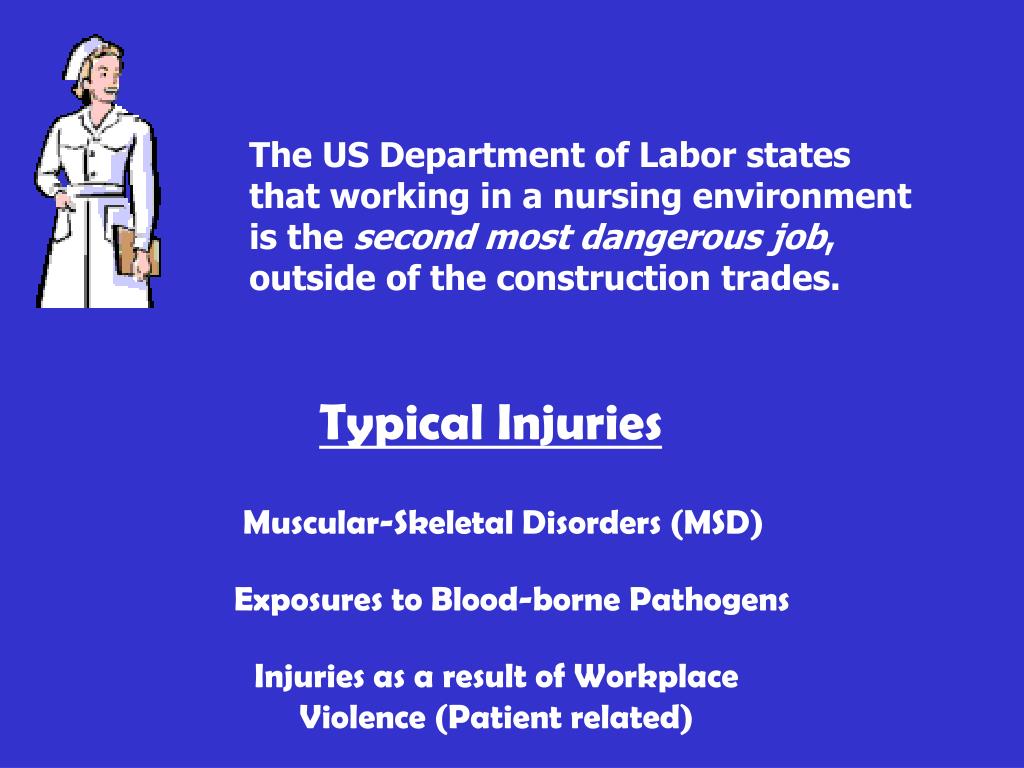 The US Department of Labor states that working in a nursing environment is the second most dangerous job, outside of the construction trades. Typical Injuries Muscular-Skeletal Disorders (MSD) Exposures to Blood-borne Pathogens Injuries as a result of Workplace Violence (Patient related)