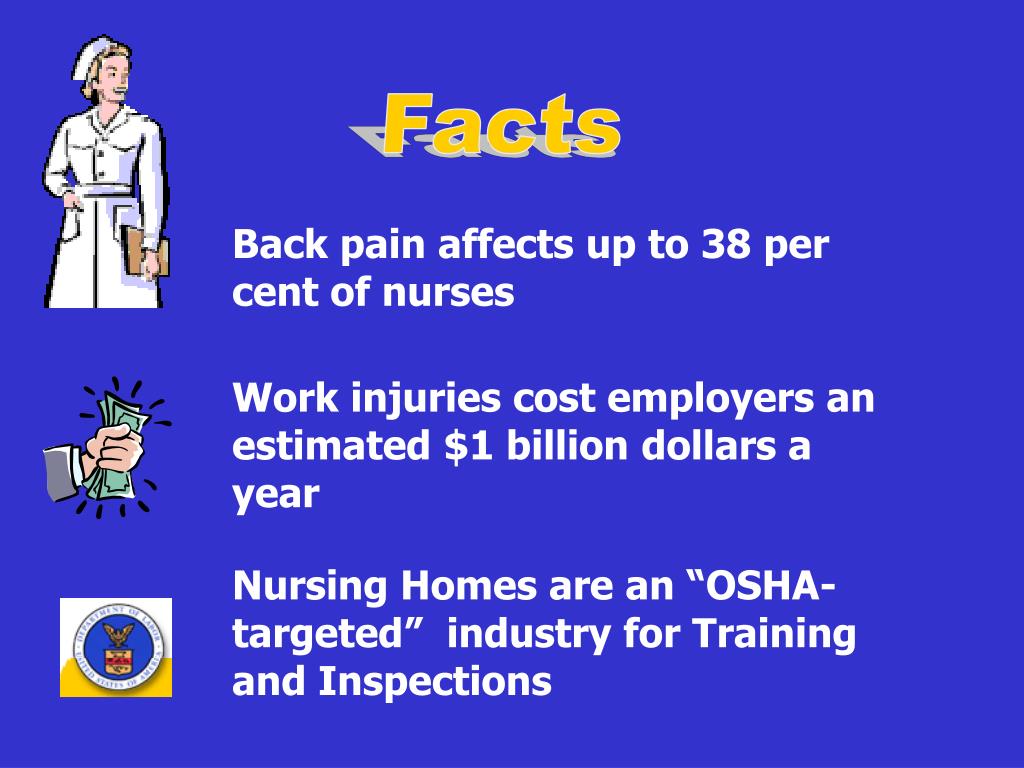 Facts Back pain affects up to 38 per cent of nurses Work injuries cost employers an estimated $1 billion dollars a year Nursing Homes are an “OSHA-targeted” industry for Training and Inspections