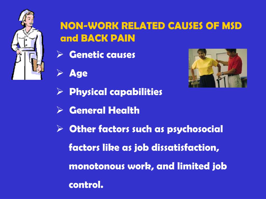 NON-WORK RELATED CAUSES OF MSD and BACK PAIN • Genetic causes • Age • Physical capabilities • General Health • Other factors such as psychosocial factors like as job dissatisfaction, monotonous work, and limited job control.