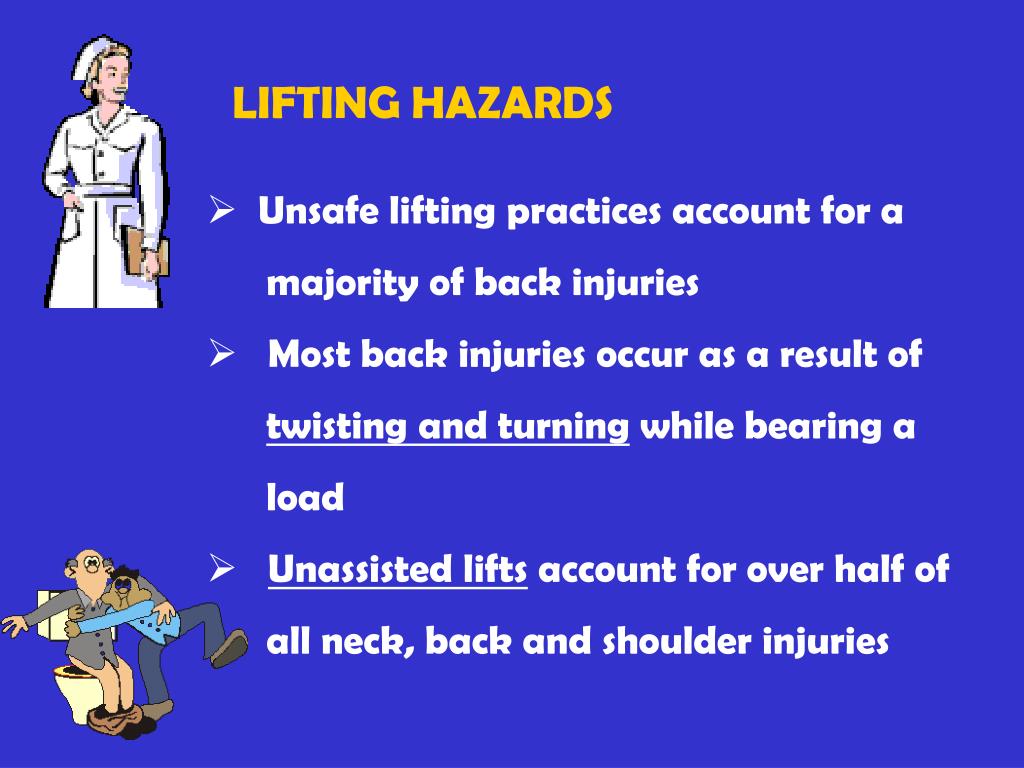 LIFTING HAZARDS • Unsafe lifting practices account for a majority of back injuries • Most back injuries occur as a result of twisting and turning while bearing a load • Unassisted lifts account for over half of all neck, back and shoulder injuries