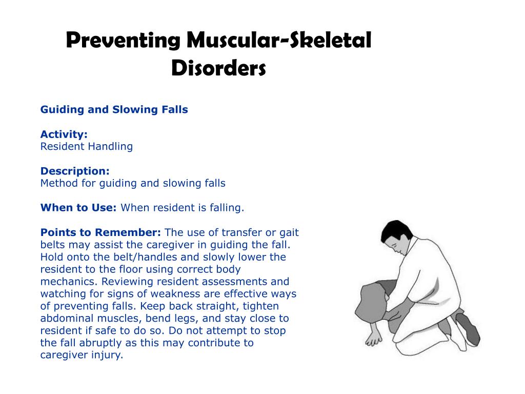 Preventing Muscular-Skeletal Disorders Guiding and Slowing FallsActivity:Resident HandlingDescription:Method for guiding and slowing fallsWhen to Use: When resident is falling.Points to Remember: The use of transfer or gait belts may assist the caregiver in guiding the fall. Hold onto the belt/handles and slowly lower the resident to the floor using correct body mechanics. Reviewing resident assessments and watching for signs of weakness are effective ways of preventing falls. Keep back straight, tighten abdominal muscles, bend legs, and stay close to resident if safe to do so. Do not attempt to stop the fall abruptly as this may contribute to caregiver injury.
