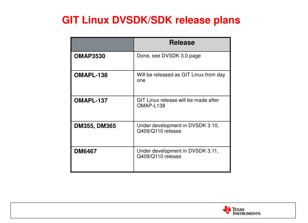 Chose your path Community first path TI delivers LSP/DVSDK to community Kernel, multimedia, and graphics Smaller set of applications Customer builds up solution Open source assets Customer assets Faster access, newer kernels More customer responsibility Commercial complementpath Commercial Linux partner pulls from community Partner adds value: Production testing, tools integration, support, application bundles, etc. for customers Service and subscription sales Executing with a number of commercial vendors TI processor customers can CHOOSE your Linux path: Community or commercial Stable Fast System Tested Fresh Roll Your Own Call ME Support Linux Options Community Commercial Or Before TI LSP Development Pull from latest prior Kernel tree