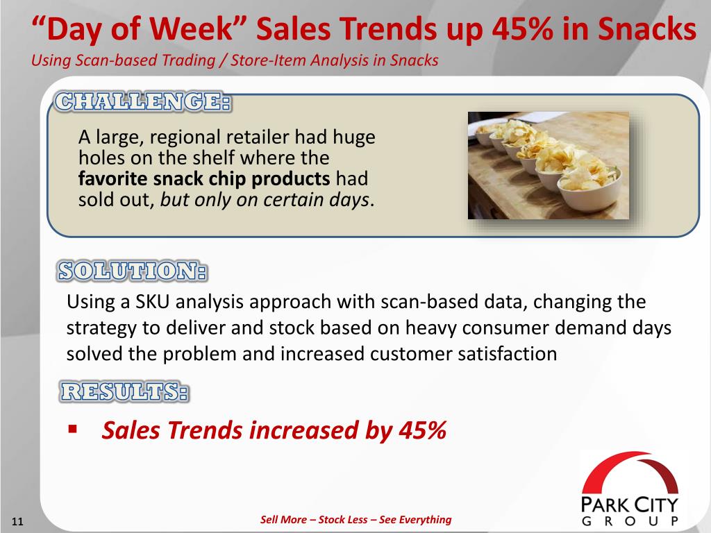 “Day of Week” Sales Trends up 45% in SnacksUsing Scan-based Trading / Store-Item Analysis in Snacks CHALLENGE: A large, regional retailer had huge holes on the shelf where the favorite snack chip products had sold out, but only on certain days. SOLUTION: Using a SKU analysis approach with scan-based data, changing the strategy to deliver and stock based on heavy consumer demand days solved the problem and increased customer satisfaction RESULTS: • Sales Trends increased by 45% Sell More – Stock Less – See Everything