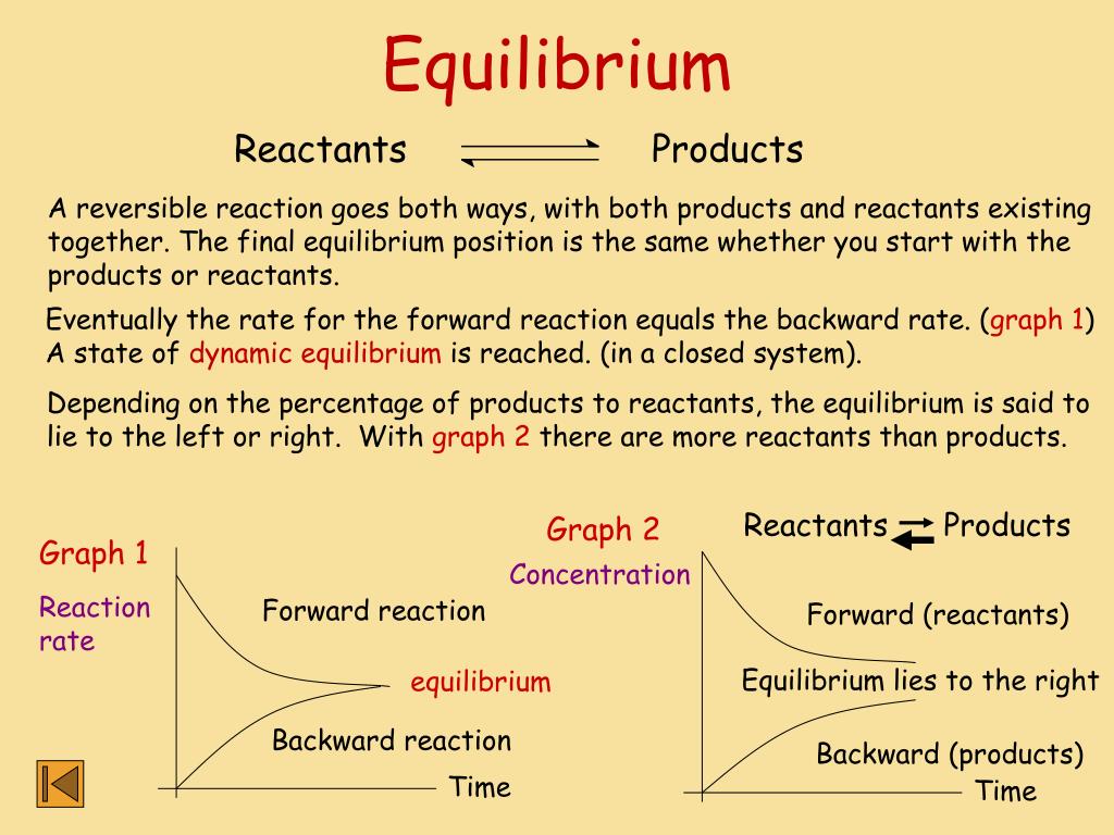 Reactants Products Graph 2 Concentration Forward (reactants) Equilibrium lies to the right Backward (products) Time Graph 1 Reaction rate Forward reaction equilibrium Backward reaction Time Equilibrium Reactants Products A reversible reaction goes both ways, with both products and reactants existing together. The final equilibrium position is the same whether you start with the products or reactants. Eventually the rate for the forward reaction equals the backward rate. (graph 1) A state of dynamic equilibrium is reached. (in a closed system). Depending on the percentage of products to reactants, the equilibrium is said to lie to the left or right. With graph 2 there aremore reactants than products.