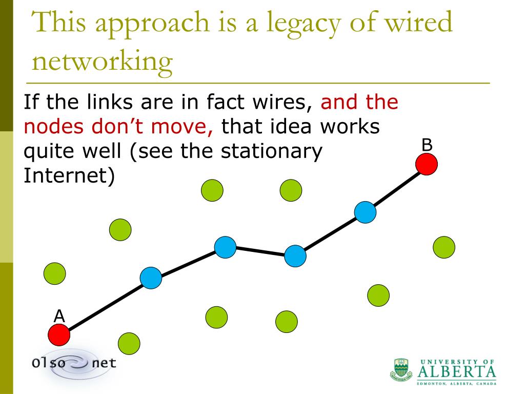 This approach is a legacy of wired networking If the links are in fact wires, and the nodes don’t move, that idea works quite well (see the stationary Internet) B A