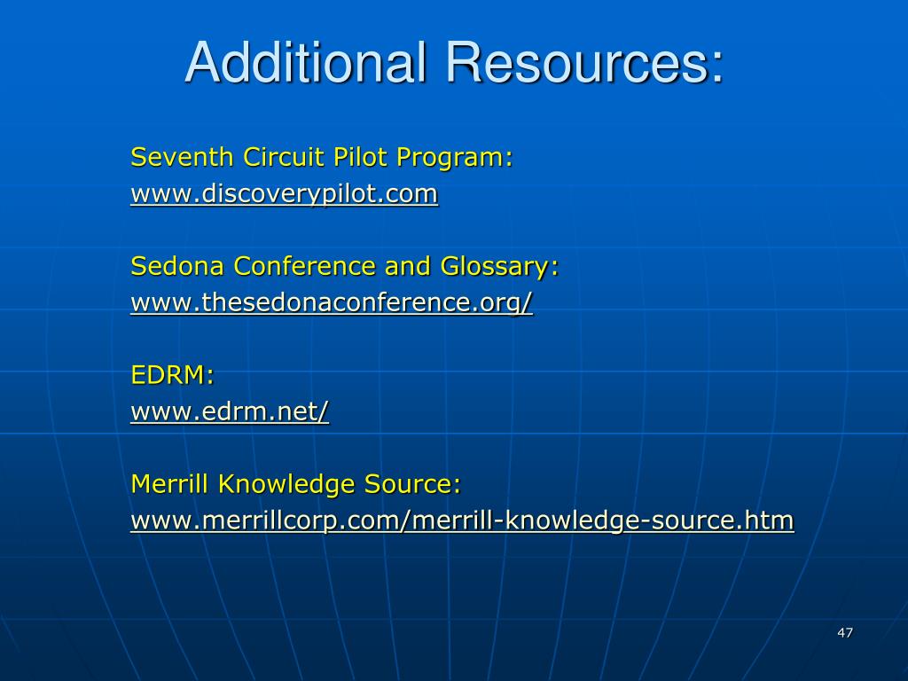 Additional Resources: Seventh Circuit Pilot Program: www.discoverypilot.com Sedona Conference and Glossary: www.thesedonaconference.org/ EDRM: www.edrm.net/ Merrill Knowledge Source: www.merrillcorp.com/merrill-knowledge-source.htm