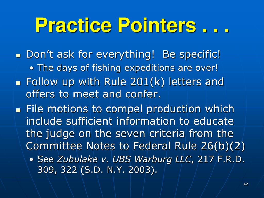 Practice Pointers . . . • Don’t ask for everything! Be specific! • The days of fishing expeditions are over! • Follow up with Rule 201(k) letters and offers to meet and confer. • File motions to compel production which include sufficient information to educate the judge on the seven criteria from the Committee Notes to Federal Rule 26(b)(2) • See Zubulake v. UBS Warburg LLC, 217 F.R.D. 309, 322 (S.D. N.Y. 2003).