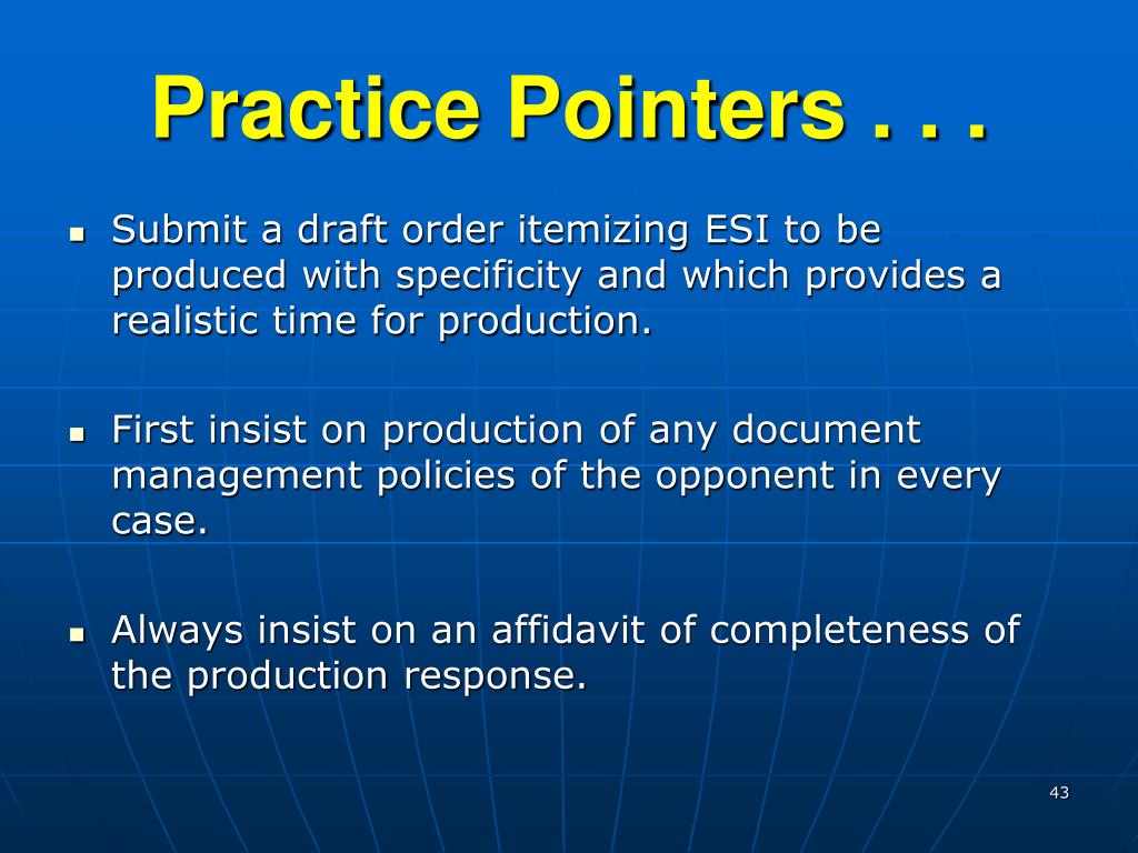 Practice Pointers . . . Submit a draft order itemizing ESI to be produced with specificity and which provides a realistic time for production. First insist on production of any document management policies of the opponent in every case. Always insist on an affidavit of completeness of the production response.