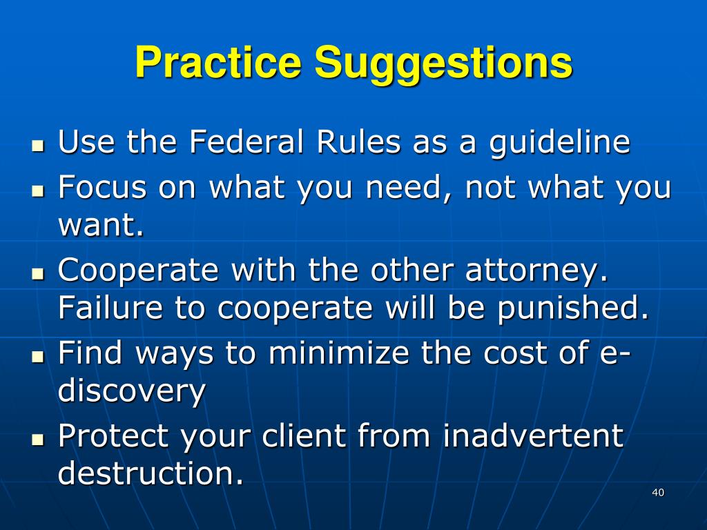Practice Suggestions Use the Federal Rules as a guideline Focus on what you need, not what you want. Cooperate with the other attorney. Failure to cooperate will be punished. Find ways to minimize the cost of e-discovery Protect your client from inadvertent destruction.