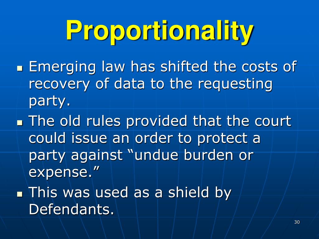 Proportionality • Emerging law has shifted the costs of recovery of data to the requesting party. • The old rules provided that the court could issue an order to protect a party against “undue burden or expense.” • This was used as a shield by Defendants.