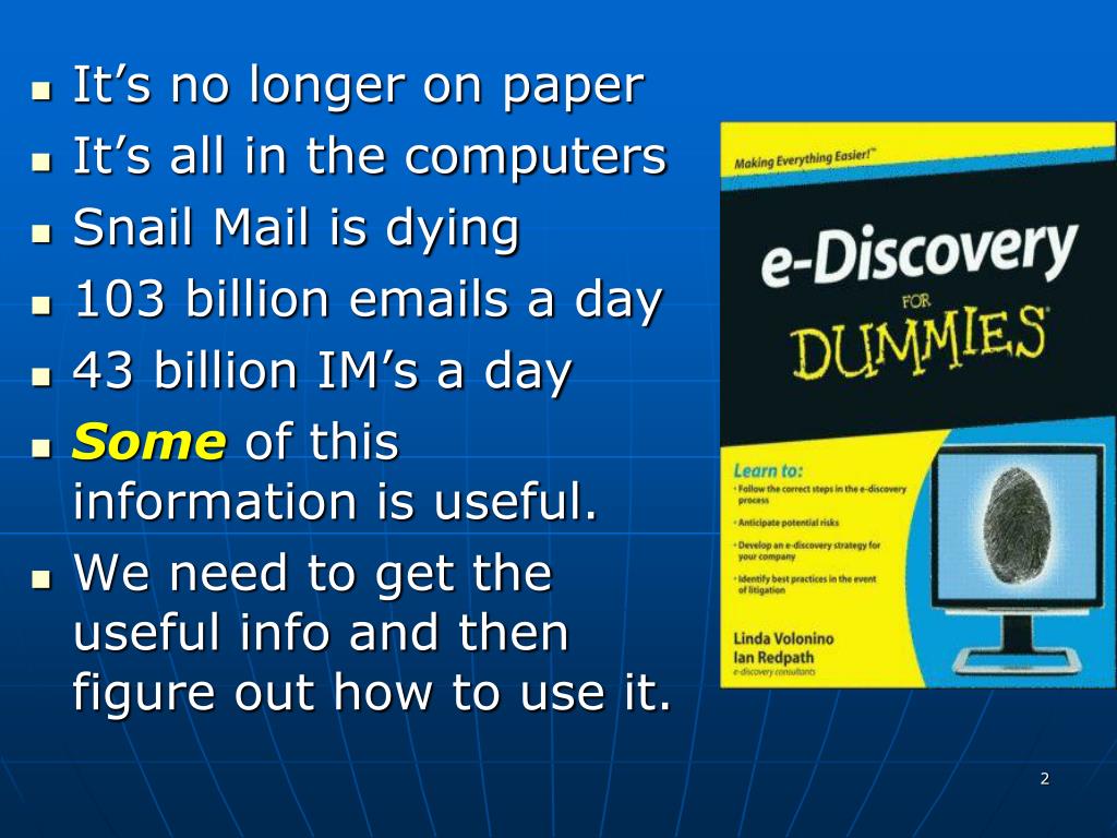 It’s no longer on paper It’s all in the computers Snail Mail is dying 103 billion emails a day 43 billion IM’s a day Some of this information is useful. We need to get the useful info and then figure out how to use it.