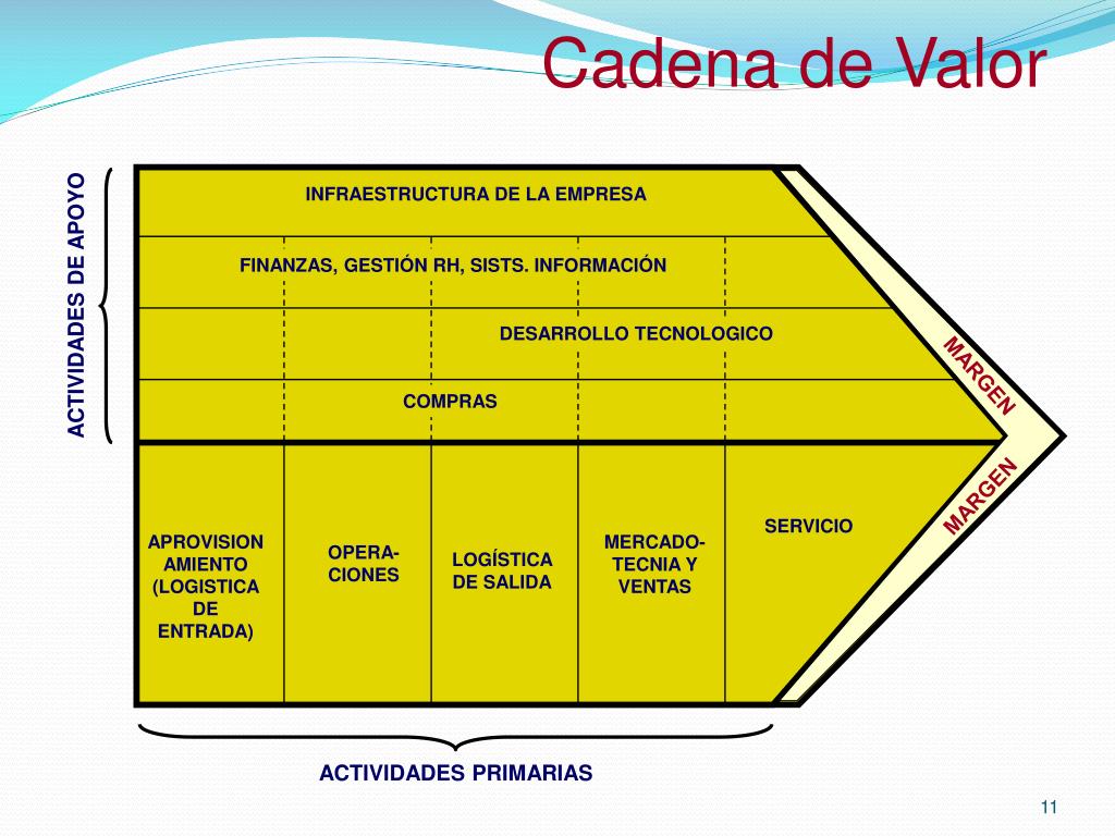 INFRAESTRUCTURA DE LA EMPRESA FINANZAS, GESTIÓN RH, SISTS. INFORMACIÓN ACTIVIDADES DE APOYO DESARROLLO TECNOLOGICO MARGEN COMPRAS MARGEN SERVICIO APROVISIONAMIENTO (LOGISTICA DE ENTRADA) MERCADO-TECNIA Y VENTAS OPERA- CIONES LOGÍSTICA DE SALIDA ACTIVIDADES PRIMARIAS Cadena de Valor