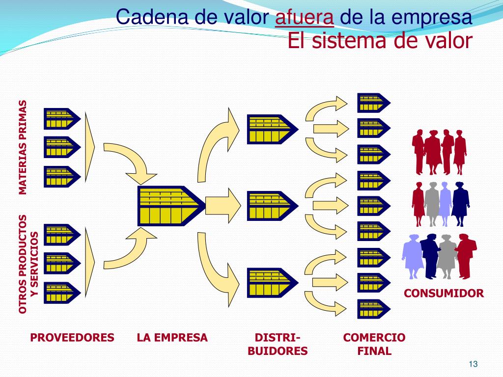 Cadena de valor afuera de la empresa El sistema de valor MATERIAS PRIMAS OTROS PRODUCTOS Y SERVICIOS CONSUMIDOR PROVEEDORES LA EMPRESA DISTRI-BUIDORES COMERCIO FINAL