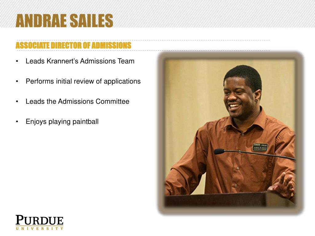 Andrae sailes Associate Director of admissions • Leads Krannert’s Admissions Team • Performs initial review of applications • Leads the Admissions Committee • Enjoys playing paintball