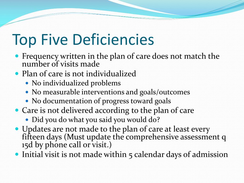 Top Five Deficiencies • Frequency written in the plan of care does not match the number of visits made • Plan of care is not individualized • No individualized problems • No measurable interventions and goals/outcomes • No documentation of progress toward goals • Care is not delivered according to the plan of care • Did you do what you said you would do? • Updates are not made to the plan of care at least every fifteen days (Must update the comprehensive assessment q 15d by phone call or visit.) • Initial visit is not made within 5 calendar days of admission