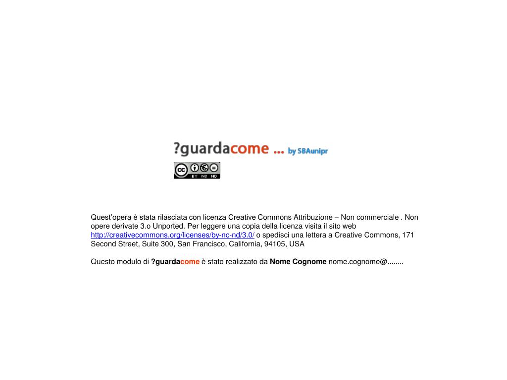 Quest’opera è stata rilasciata con licenza Creative Commons Attribuzione – Non commerciale . Non opere derivate 3.o Unported. Per leggere una copia della licenza visita il sito web http://creativecommons.org/licenses/by-nc-nd/3.0/ o spedisci una lettera a Creative Commons, 171 Second Street, Suite 300, San Francisco, California, 94105, USA Questo modulo di ?guardacomeè stato realizzato da Nome Cognome nome.cognome@........