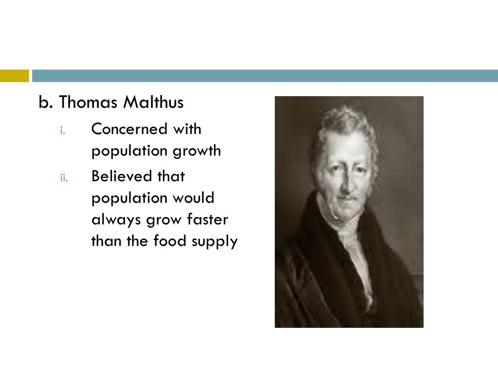 b. Thomas Malthus • Concerned with population growth • Believed that population would always grow faster than the food supply