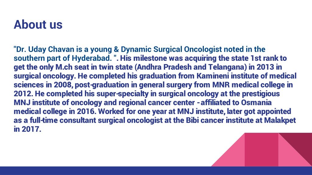 About us "Dr. Uday Chavan is a young & Dynamic Surgical Oncologist noted in the southern part of Hyderabad. ". His milestone was acquiring the state 1st rank to get the only M.ch seat in twin state (Andhra Pradesh and Telangana) in 2013 in surgical oncology. He completed his graduation from Kamineni institute of medical sciences in 2008, post-graduation in general surgery from MNR medical college in 2012. He completed his super-specialty in surgical oncology at the prestigious MNJ institute of oncology and regional cancer center - affiliated to Osmania medical college in 2016. Worked for one year at MNJ institute, later got appointed as a full-time consultant surgical oncologist at the Bibi cancer institute at Malakpet in 2017.