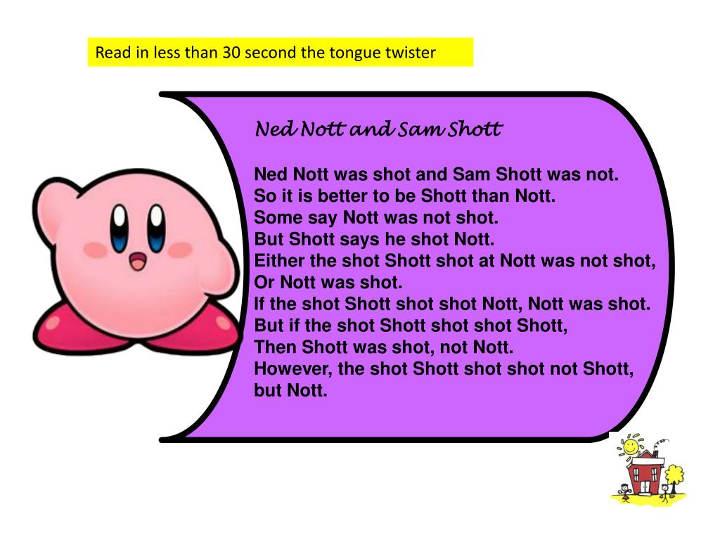 Read in less than 30 second the tongue twister NedNott and Sam Shott NedNottwasshot and Sam Shottwasnot.So itisbettertobeShottthanNott.SomesayNottwasnotshot.ButShottsays he shotNott.EithertheshotShottshot at Nottwasnotshot,OrNottwasshot.IftheshotShottshotshotNott, Nottwasshot.ButiftheshotShottshotshotShott,ThenShottwasshot, notNott.However, theshotShottshotshotnotShott, butNott.