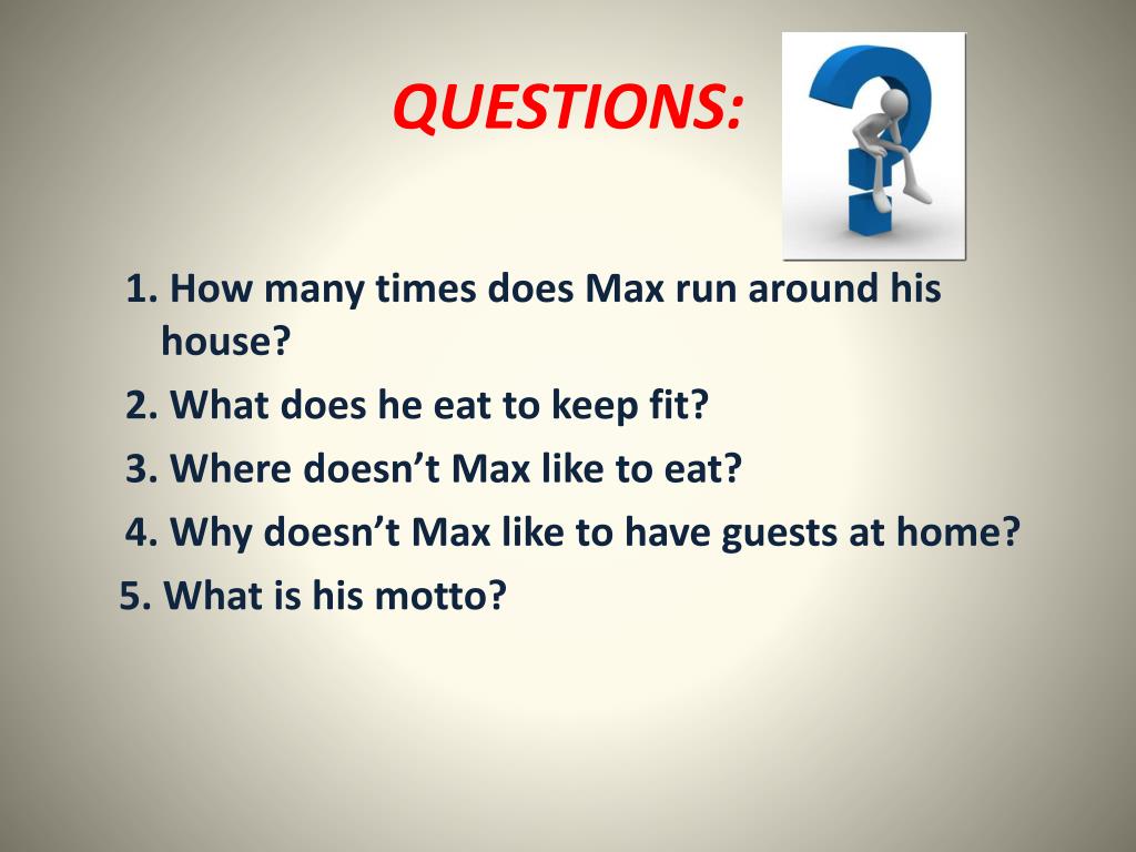 QUESTIONS: 1.How many times does Max run around his house? 2. What does he eat to keep fit? 3. Where doesn’t Max like to eat? 4. Why doesn’t Max like to have guests at home? 5. What is his motto?