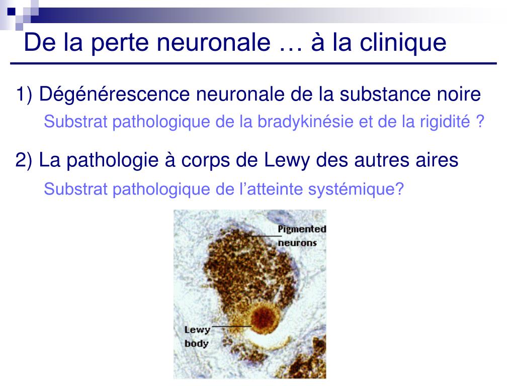 De la perte neuronale … à la clinique 1) Dégénérescence neuronale de la substance noire Substrat pathologique de la bradykinésie et de la rigidité ? 2) La pathologie à corps de Lewy des autres aires Substrat pathologique de l’atteinte systémique?