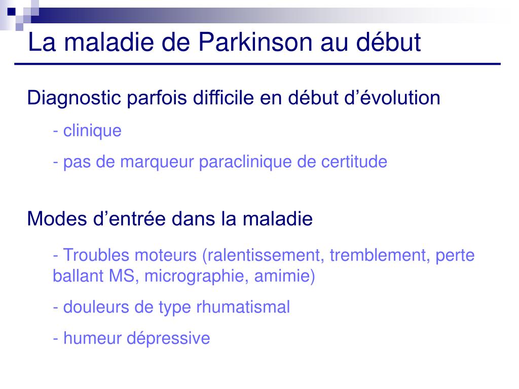 La maladie de Parkinson au début Diagnostic parfois difficile en début d’évolution - clinique - pas de marqueur paraclinique de certitude Modes d’entrée dans la maladie - Troubles moteurs (ralentissement, tremblement, perte ballant MS, micrographie, amimie) - douleurs de type rhumatismal - humeur dépressive