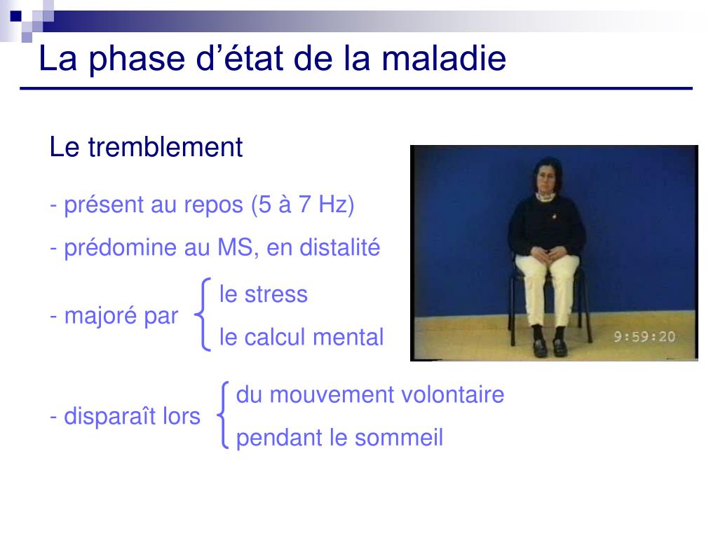 La phase d’état de la maladie Le tremblement - présent au repos (5 à 7 Hz) - prédomine au MS, en distalité le stress le calcul mental - majoré par du mouvement volontaire pendant le sommeil - disparaît lors
