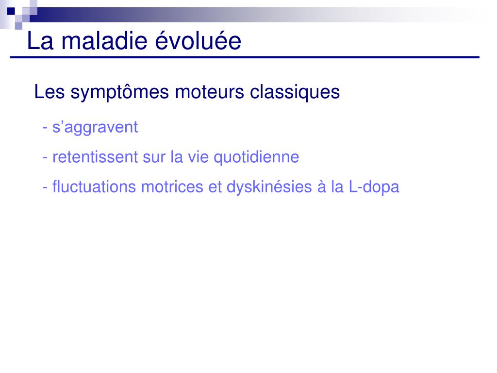La maladie évoluée Les symptômes moteurs classiques - s’aggravent - retentissent sur la vie quotidienne - fluctuations motrices et dyskinésies à la L-dopa