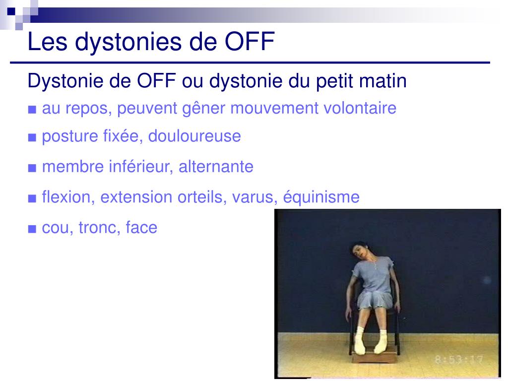 Les dystonies de OFF Dystonie de OFF ou dystonie du petit matin ■ au repos, peuvent gêner mouvement volontaire ■ posture fixée, douloureuse ■ membre inférieur, alternante ■ flexion, extension orteils, varus, équinisme ■ cou, tronc, face