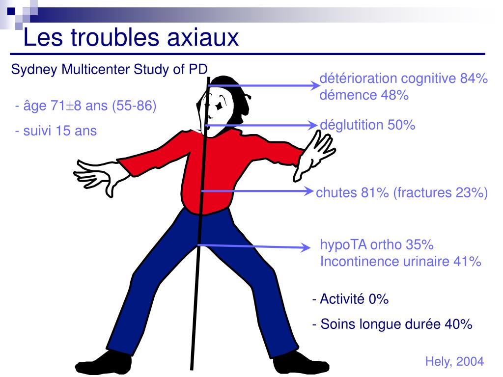 Les troubles axiaux Sydney Multicenter Study of PD détérioration cognitive 84% démence 48% - âge 718 ans (55-86) - suivi 15 ans déglutition 50% chutes 81% (fractures 23%) hypoTA ortho 35% Incontinence urinaire 41% - Activité 0% - Soins longue durée 40% Hely, 2004