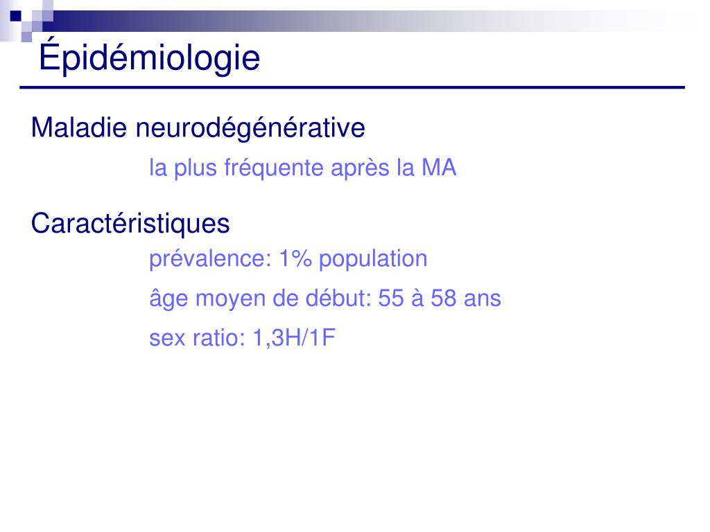 Épidémiologie Maladie neurodégénérative la plus fréquente après la MA Caractéristiques prévalence: 1% population âge moyen de début: 55 à 58 ans sex ratio: 1,3H/1F