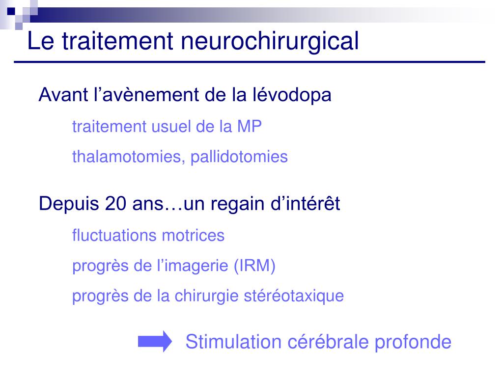 Le traitement neurochirurgical Avant l’avènement de la lévodopa traitement usuel de la MP thalamotomies, pallidotomies Depuis 20 ans…un regain d’intérêt fluctuations motrices progrès de l’imagerie (IRM) progrès de la chirurgie stéréotaxique Stimulation cérébrale profonde