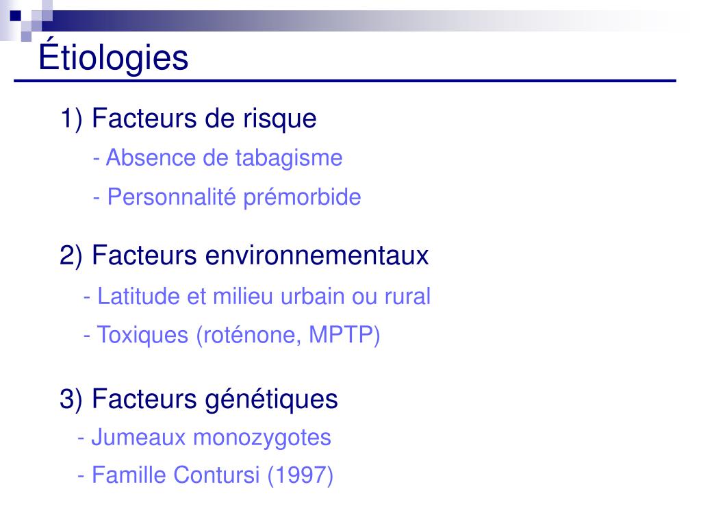 Étiologies 1) Facteurs de risque - Absence de tabagisme - Personnalité prémorbide 2) Facteurs environnementaux - Latitude et milieu urbain ou rural - Toxiques (roténone, MPTP) 3) Facteurs génétiques - Jumeaux monozygotes - Famille Contursi (1997)