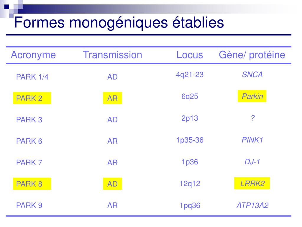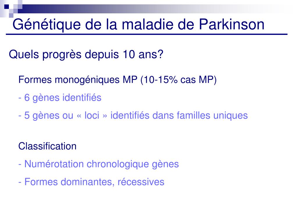Génétique de la maladie de Parkinson Quels progrès depuis 10 ans? Formes monogéniques MP (10-15% cas MP) - 6 gènes identifiés - 5 gènes ou « loci » identifiés dans familles uniques Classification - Numérotation chronologique gènes - Formes dominantes, récessives