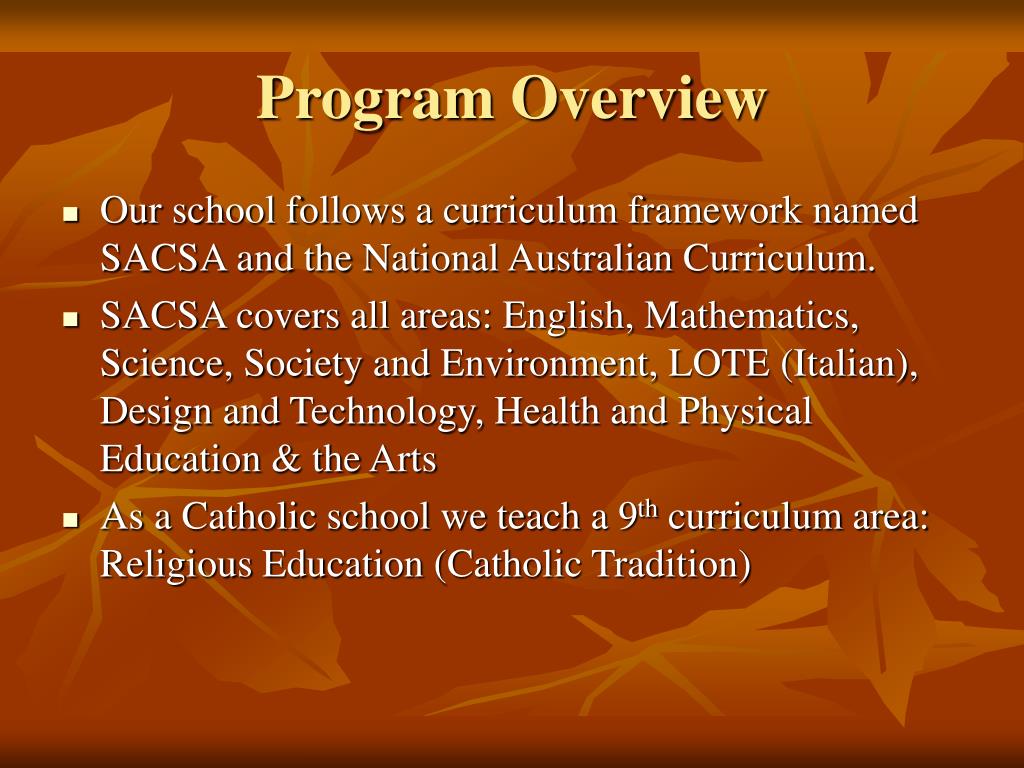 Program Overview • Our school follows a curriculum framework named SACSA and the National Australian Curriculum. • SACSA covers all areas: English, Mathematics, Science, Society and Environment, LOTE (Italian), Design and Technology, Health and Physical Education & the Arts • As a Catholic school we teach a 9th curriculum area: Religious Education (Catholic Tradition)