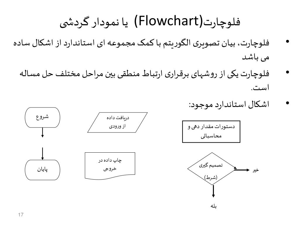 شروع دریافت داده از ورودی پایان تصمیم گیری (شرط) چاپ داده در خروجی فلوچارت (Flowchart) یا نمودار گردشی • فلوچارت، بیان تصویری الگوریتم با کمک مجموعه ای استاندارد از اشکال ساده می باشد • فلوچارت یکی از روشهای برقراری ارتباط منطقی بین مراحل مختلف حل مساله است. • اشکال استاندارد موجود: دستورات مقدار دهی و محاسباتی خیر بله