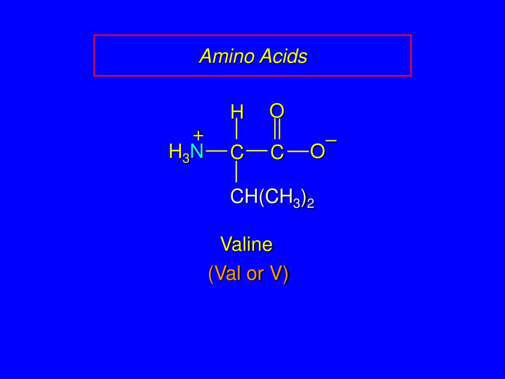 Amino Acids O H + – H3N O C C CH(CH3)2 Valine (Val or V)